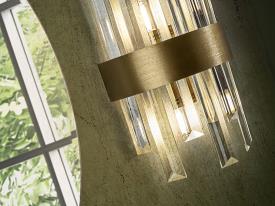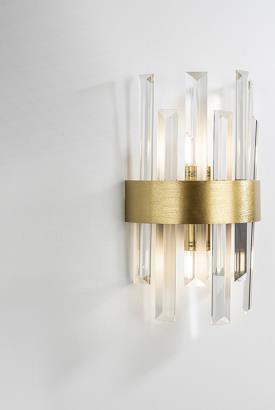 Applique murale 2 lumières, en métal brossé finition or. Diffuseur composé de tiges de verre transparent en forme de prisme.