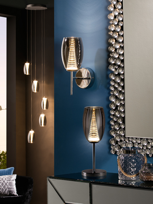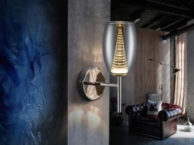 Lampe murale 1 lumière LED, réalisée en métal finition chrome. Double tulipe, extérieur réalisé en verre miroitant et intérieur en polycarbonate transparent avec forme de cône échelonné. 5W LED. 450 lm 3.000 K.