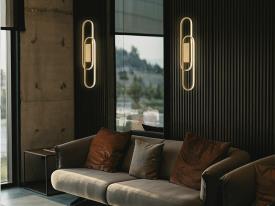 Applique en aluminium et métal, finition or mat. 2 ovales avec lumière LED et diffuseur en silicone opale. LED 24W. 2.100 lm. 3.000 K.