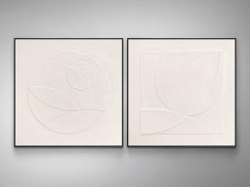 Ensemble de deux bas-reliefs réalisés avec des feuilles EVA décorées et montées sur cadre. Cadre en polystyrène noir. Préparé pour suspendre en position horizontale ou verticale.