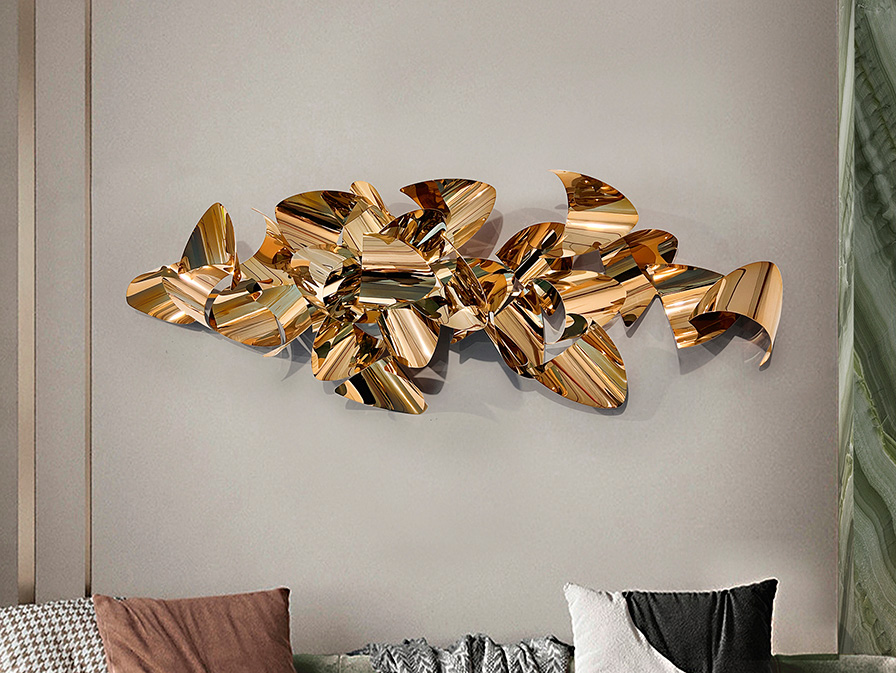 Sculpture murale en tôle d'acier inoxydable, composition de pièces courbes en finition plaqué or rose. Prête à être suspendue horizontalement et verticalement.