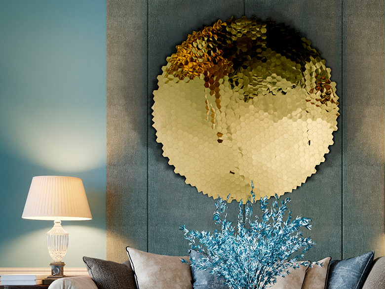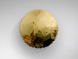 Bas-relief acier doré Dimensions : Ø 100 x p 9 cm Bas-relief en tôle d'acier inoxydable, formant une grille sphérique de polyèdres. Finition plaquée or brillant.