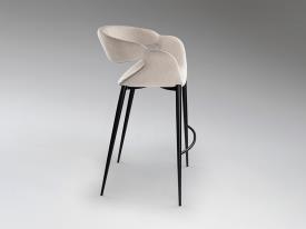 Tabouret haut. Revêtement textile 100% polyester couleur pierre claire, avec surpiqûres décoratives. Nettoyage à sec. Pieds en métal noir mat avec repose-pieds. Assise et dossier en contreplaqué et mousse.