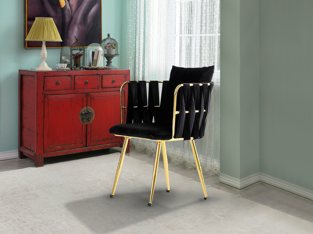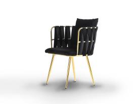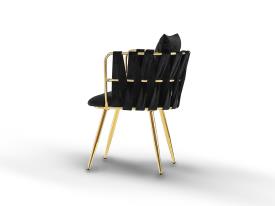 Fauteuil réalisé en métal finition feuille or brillant, avec siège capitonné en velours noir et dossier avec des bandeaux tressés du même tissu. Coussin inclus.