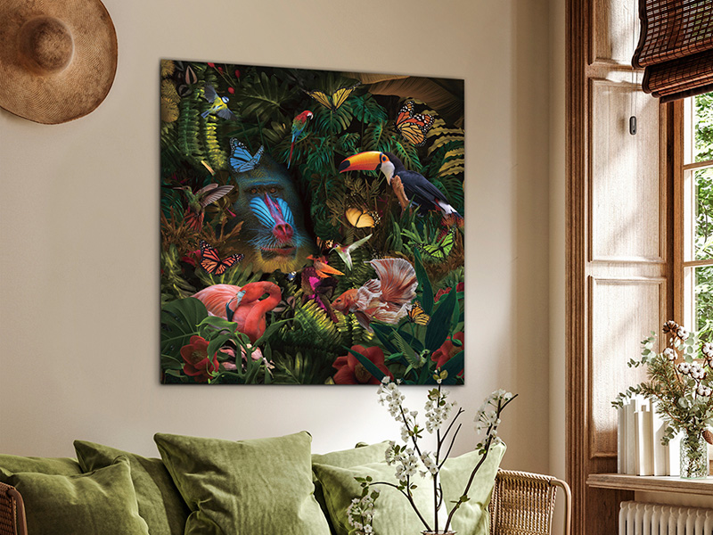 Photographie 100x100 Dimensions : l 100 x h 100 x p 0,4 cm photographie imprimée, montée sur verre trempé. Comprend le matériel pour le montage mural.