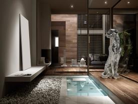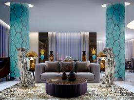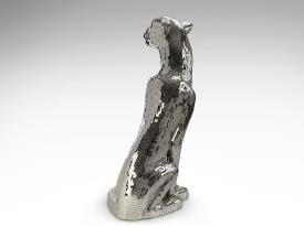Figure de léopard assis, réalisée en fibre de verre et décorée avec des mosaïques de pièces rectangulaires de miroir argenté, sur fond blanc. Regarde vers la droite.