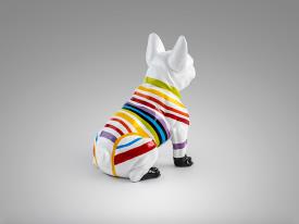 Figurine de bouledogue français, petite taille, en résine. Décoration : peinture blanche avec des rayures de couleur.