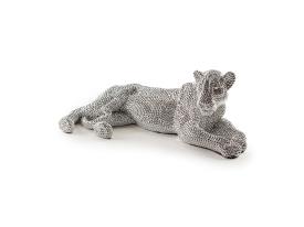 Figure petite de lionne allongée, réalisée en polyrésine. Finition argent avec texture imitation incrustations de pierreries.