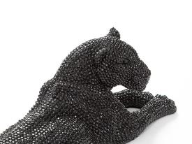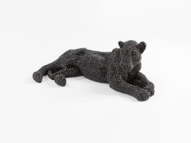 Figure petite de lionne allongée, réalisée en polyrésine. Finition en noir brillant avec texture imitation incrustations de pierreries.
