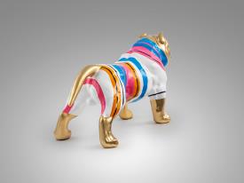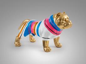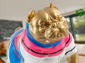 Figurine Pitbull, taille moyenne, en résine. Décoration : peinture dorée avec rayures colorées.
