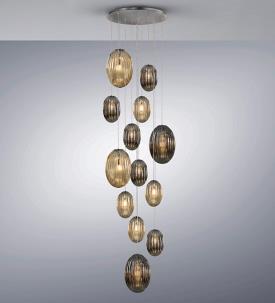 Lampe 13 lumières, réalisée en métal finition chrome. Tulipes combinées : grandes et petites. Deux tons pour le verre : cognac et gris smoke miroitant. Réglable en hauteur.