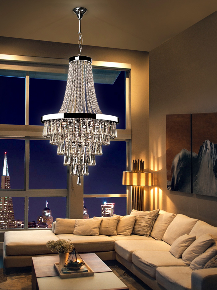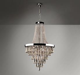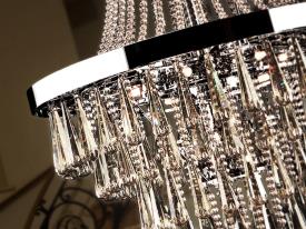 Lampe en métal finition chrome brillant, chaînes de boules en verre et grandes larmes en verre fumé à facettes K9.