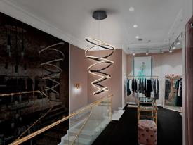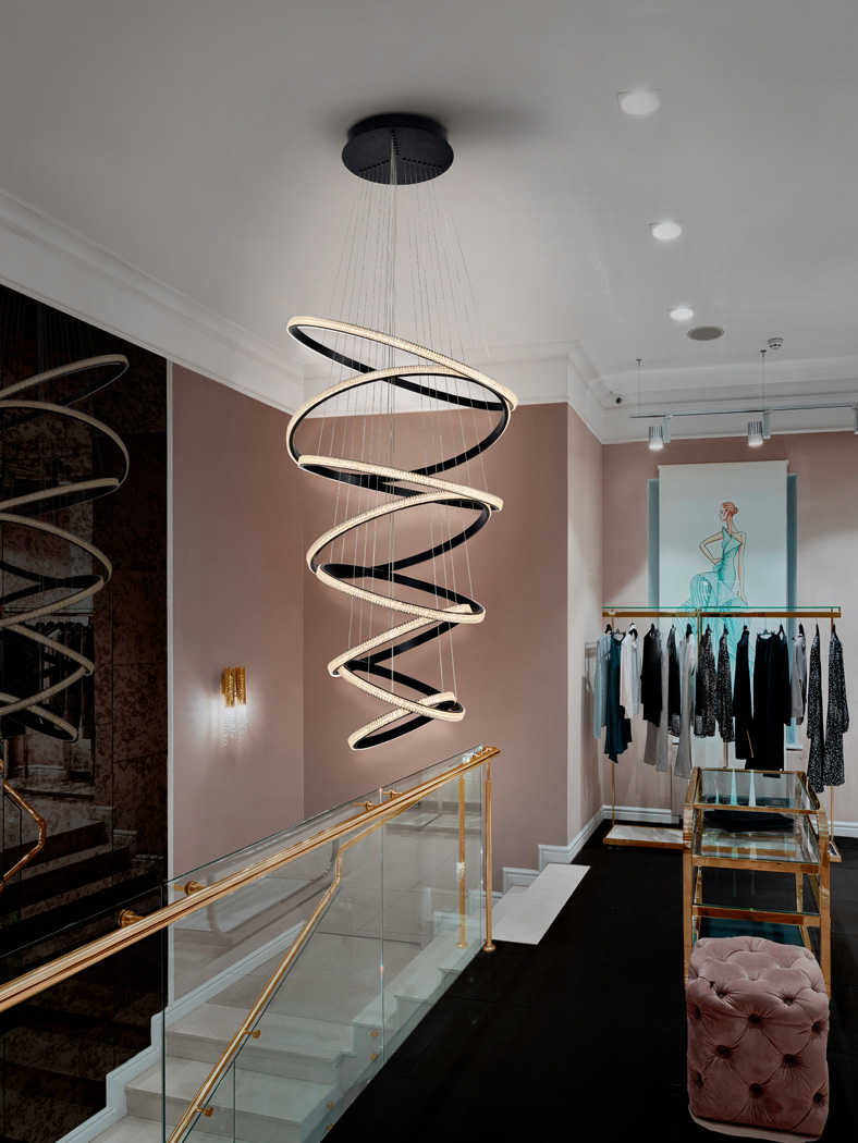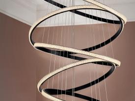 Lampe en métal et aluminium, finition noir mat sablé. Huit anneaux réglables en hauteur, avec diffuseur en acrylique transparent. LED 162W. 8.100 lm. 3.000 K. Elle inclut le driver TRIAC et le SET DIMADO.