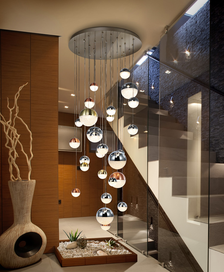 Lampe GRAND FORMAT. 27 lumières LED. Tulipes de 10/12/20 cm Ø en polycarbonate, intérieur texturisé et métal cuivre et laiton satiné et chrome. DIMMABLE et CCT, temp. couleur 3.000K a 4.000K. Commande BLUETOOTH avec APP pour smartphone. 147,6W LED 10