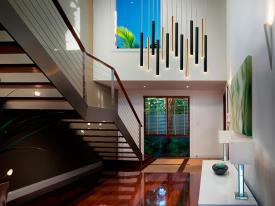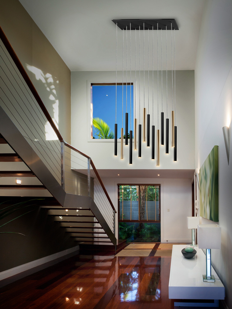 Lampe 14 lumières LED. Réalisée en métal finition or et noir mat. Diffuseur acrylique opale. 70W LED, 6,300 lm, 3.000 K. Hauteur maximale 300cm. DIMMABLE.