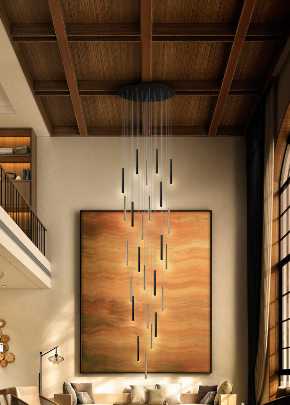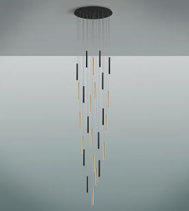 Lampe ronde 25 lumières LED. Réalisée en métal finition or et noir mat. Diffuseur acrylique opale. 125W LED, 11.250 lm, 3.000 K. Hauteur maximale 500cm. DIMMABLE.