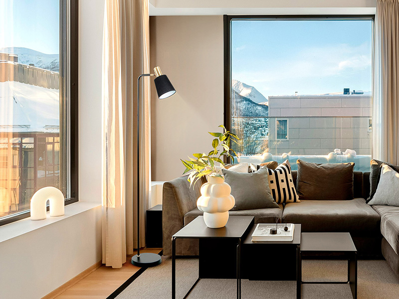 Lampadaire en métal finition noir mat avec détails en laiton satiné. Abat-jour en textile noir à inclinaison réglable. 1 E27.