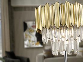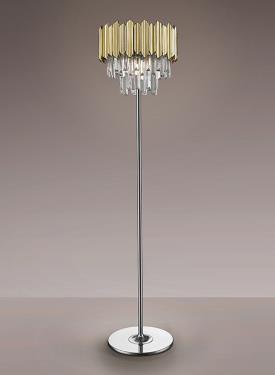 Lampadaire en métal avec finition chromée. Abat-jour en prismes de verre à facettes avec garniture en abs plaqué or.