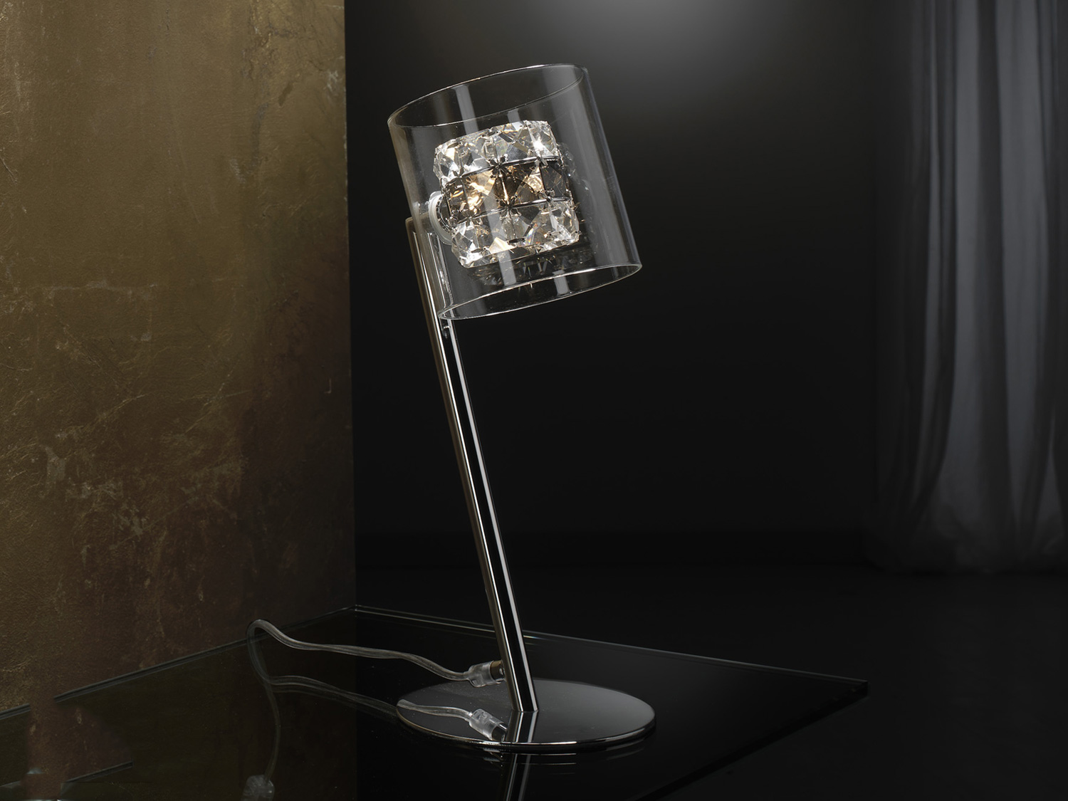 Lampe de table à une lumière en métal, finition chromée. Abat-jour double en verre moulé à l'extérieur et cristaux facettés transparents et fumés à l'intérieur. Prise de type G (Royaume-Uni).