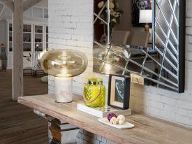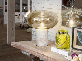 Lampe de Table 1 lumière, réalisé en marbre blanc. Tulipe en verre soufflé couleur ambre.