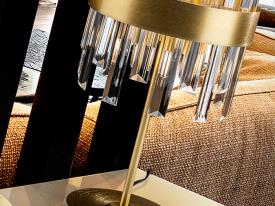Lampe de table 6 lumières, en métal brossé, finition dorée. Diffuseur avec des tiges de verre transparent en forme de prisme.