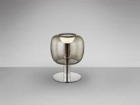 Lampe de table en métal avec finition chromée. Tulipe en verre soufflé finition fumée. Éclairage LED 5W, 500 lm, 3.000K.