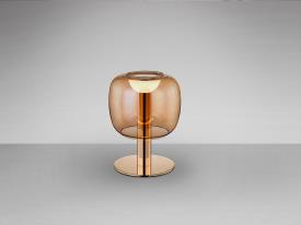 Lampe de table en métal, finition or brillant. Tulipe en verre soufflé finition ambre. Éclairage LED 5W, 500 lm, 3.000K.