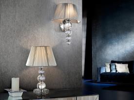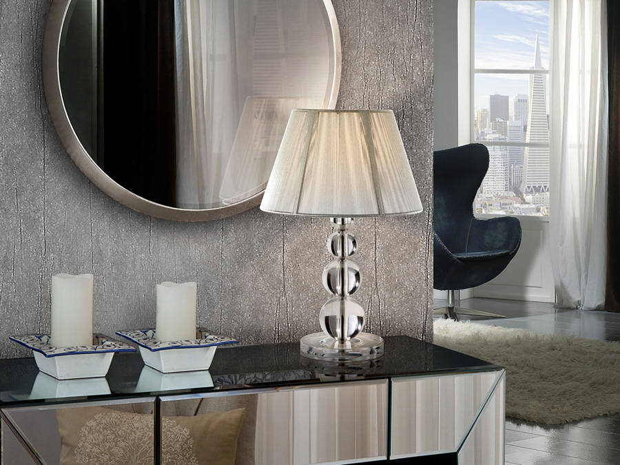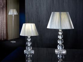 Lampe de table, petite, à une lumière, en métal finition chrome brillant et méthacrylate transparent. Socle en méthacrylate transparent. Abat-jour en fil tendu de couleur argent, avec doublure à l'intérieur.