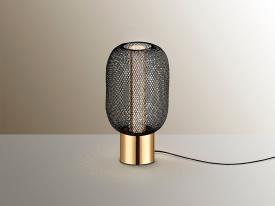 Lampe de table 1 lumière en métal avec finition or brillant et noir. Tulipe double avec cylindre intérieur en acrylique transparent avec bulles et ovale extérieur en maille métallique noire. LED 5W, 450 lm, 3.000 K.