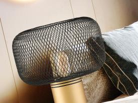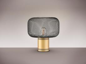 Lampe de table 1 lumière en métal avec finition peinture dorée, tulipe en maille métallique noir mat.