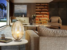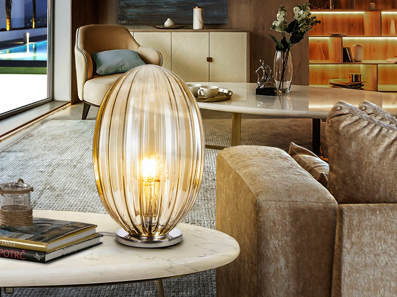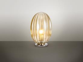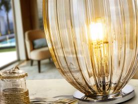 Lampe de table 1 lumière, en métal, finition chromée. Petit abat-jour en verre de couleur cognac.