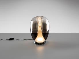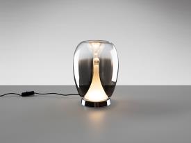 Lampe de table en aluminium chromé, avec tulipe en verre soufflé, finition fumée dégradée et diffuseur intérieur opale. LED 8,5W, 504 lm, 3.000 K.