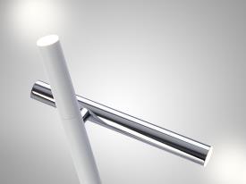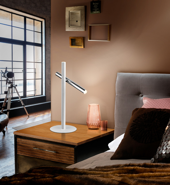 Lampe de table 2 lumières LED. Réalisée en métal finition chrome et blanc mat. Diffuseur acrylique opale. 10W LED, 900 lm, 3.000 K.