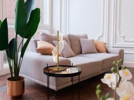 Lampe de table en métal et en aluminium, finition or mat. Diffuseur courbe en méthacrylate micro-imprimé. 8.5W LED, 470 lm, 3.000K.