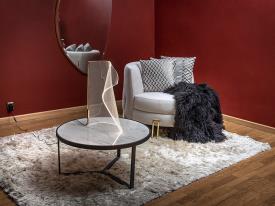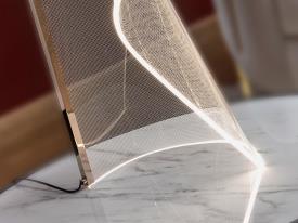 Lampe de table composée d'une feuille de méthacrylate moulée et micro-imprimée et d'un profilé métallique en finition or rose. Éclairage LED 12W 600 lm 3.000K.