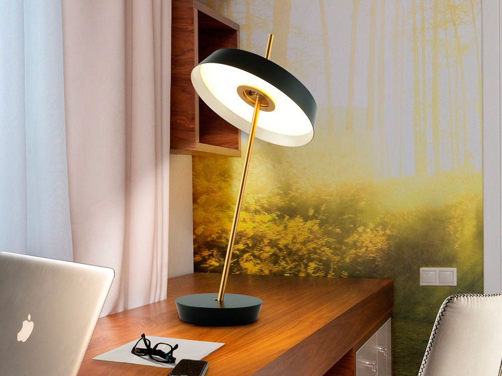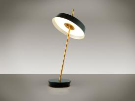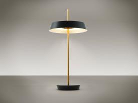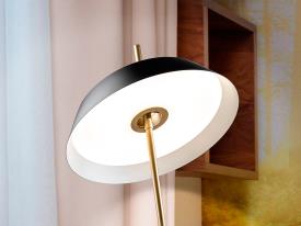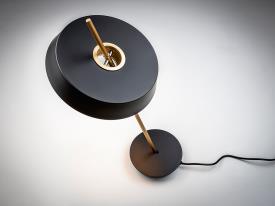 Lampe de table LED à inclinaison réglable. Fabriquée en métal, finition en noir mat et peinture dorée. Abat-jour avec diffuseur en méthacrylate opale. LED 12W, 1 080 lm, 3 000K.