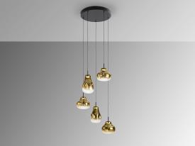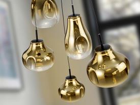 Lampe à 5 lumières en métal fini noir mat. Tulipes en verre soufflé, finition doré délavé à transparent. Réglable en hauteur. 30W LED, 1800 lm, 3 000 K.
