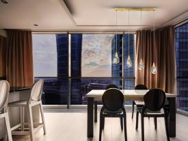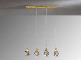 Lampe 4 lumières led, réalisée en métal finition or mat. Tulipe polyédrique réalisée en verre massif avec bulles décoratives à l’intérieur. Réglable en hauteur. 16w led. 1800 lm. 3.000 k.