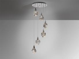 Lampe 6 lumières led, réalisée en métal finition chrome. Tulipe polyédrique réalisée en verre massif avec bulles décoratives à l’intérieur. Réglable en hauteur. 24w led. 2700 lm. 3.000 k.
