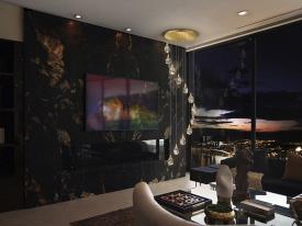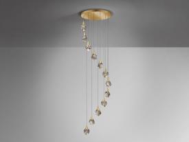 Lampe 12 lumières led, réalisée en métal finition or mat. Tulipe polyédrique réalisée en verre massif avec bulles décoratives à l’intérieur. Réglable en hauteur. 48w led. 5400 lm. 3.000 k.