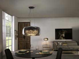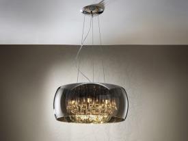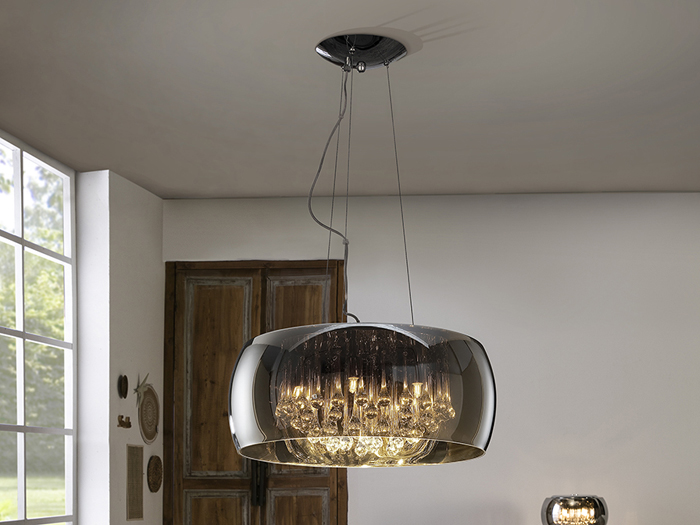 Lampe pendante réalisée en métal finition chrome. Tulipe en verre miroitant et larmes intérieures en verre type Murano. DIMMABLE. Télécommande incluse.