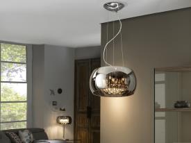 Pendante en métal finition chrome. Tulipe en verre sans tain. Larmes intérieures en verre type Murano.