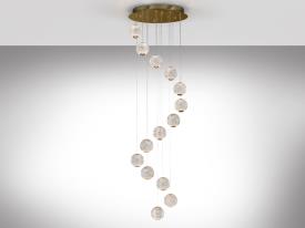 Lampe ronde 14 lumières LED, métal finition or. Tulipes sphériques de Ø 11cm en acrylique optique transparente, dessin à facettes. 69W LED. 3.200K, 3.745 lm.