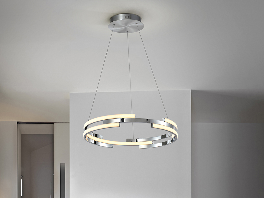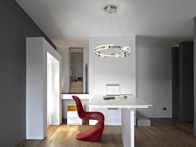 Lampe en métal et aluminium, finition chromée. Diffuseur en silicone opale. LED 52W. 3.800 lm. 3.000 K. REGLABLE EN INTENSITÉ.