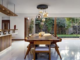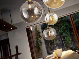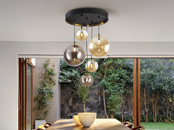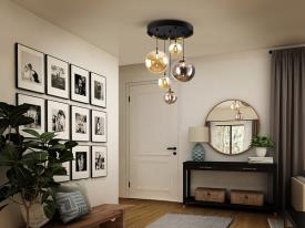 Lampe 5 lumières en métal finition noir mat, avec détails en laiton satiné. Tulipes sphériques en verre de 12 et 20 cm, finition miroitée ambre et gris fumée. Réglable en hauteur.