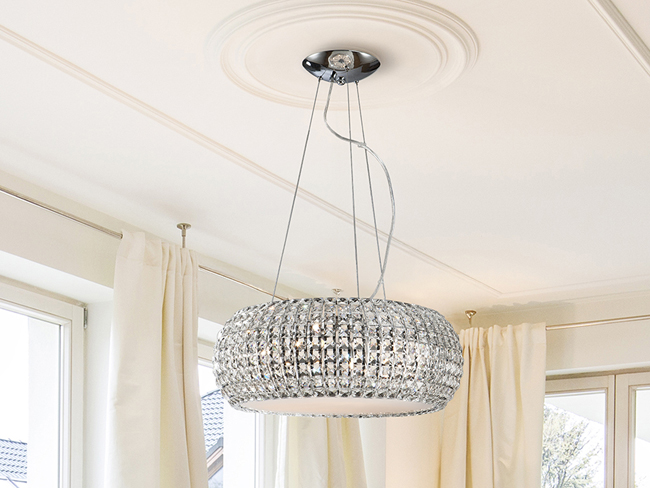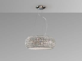 Pendante, grande, en métal finition chrome. Tulipe composée par des gouttes carrées en verre transparent. Inclut diffuseur inférieur en verre opale.
