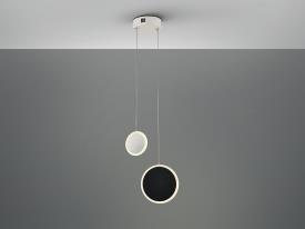 Lampe composée de deux disques suspendus avec lumière périphérique. Fabriqué en métal avec une finition mate noire et blanche. Diffuseur en acrylique opale. LED DE 9W. 530lm. 3.000k