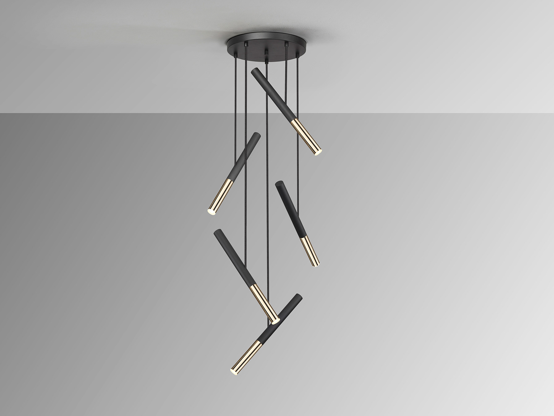 Lampe 5 lumières, en métal avec finition noir mat et or brillant. Diffuseurs en acrylique opale. Hauteur réglable. LED 25W, 2 250 lm, 3 000 K. DIMMABLE.