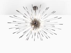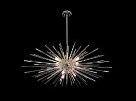 Lampe sphérique réalisée en métal chromé. Tiges radiales en verre transparent avec pointes décorées dans bain de chrome foncé. Hauteur réglable. DIMMABLE. Inclut télécommande.