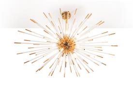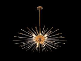 Lampe sphérique réalisée en métal finition or brillant. Tiges radiales en verre transparent avec pointes décorées ambre. Hauteur réglable.